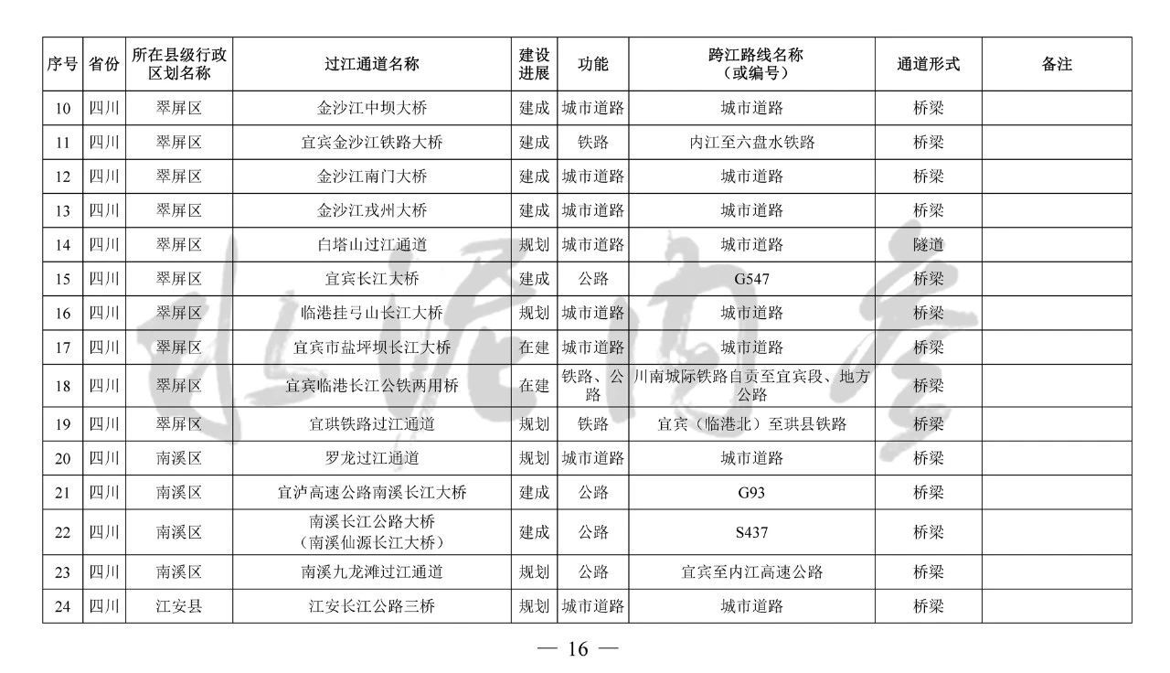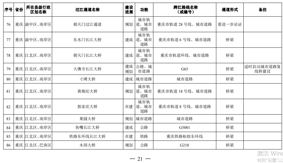 重庆市(17座):市域(郊)铁路跳蹬至江津线长江大桥、西彭长江大桥(支坪长江大桥)、小南海长江大桥、中坝过江通道、黄桷坪长江大桥、轨道27号线过江通道、重庆至黔江铁路过江通道、黄桷沱大桥、长寿长江三桥、涪陵石沱长江大桥、涪陵龙头港长江大桥、涪陵江北长江大桥、兴义长江大桥、西沱长江大桥、云阳复兴长江大桥、奉节二桥、巫山长江二桥