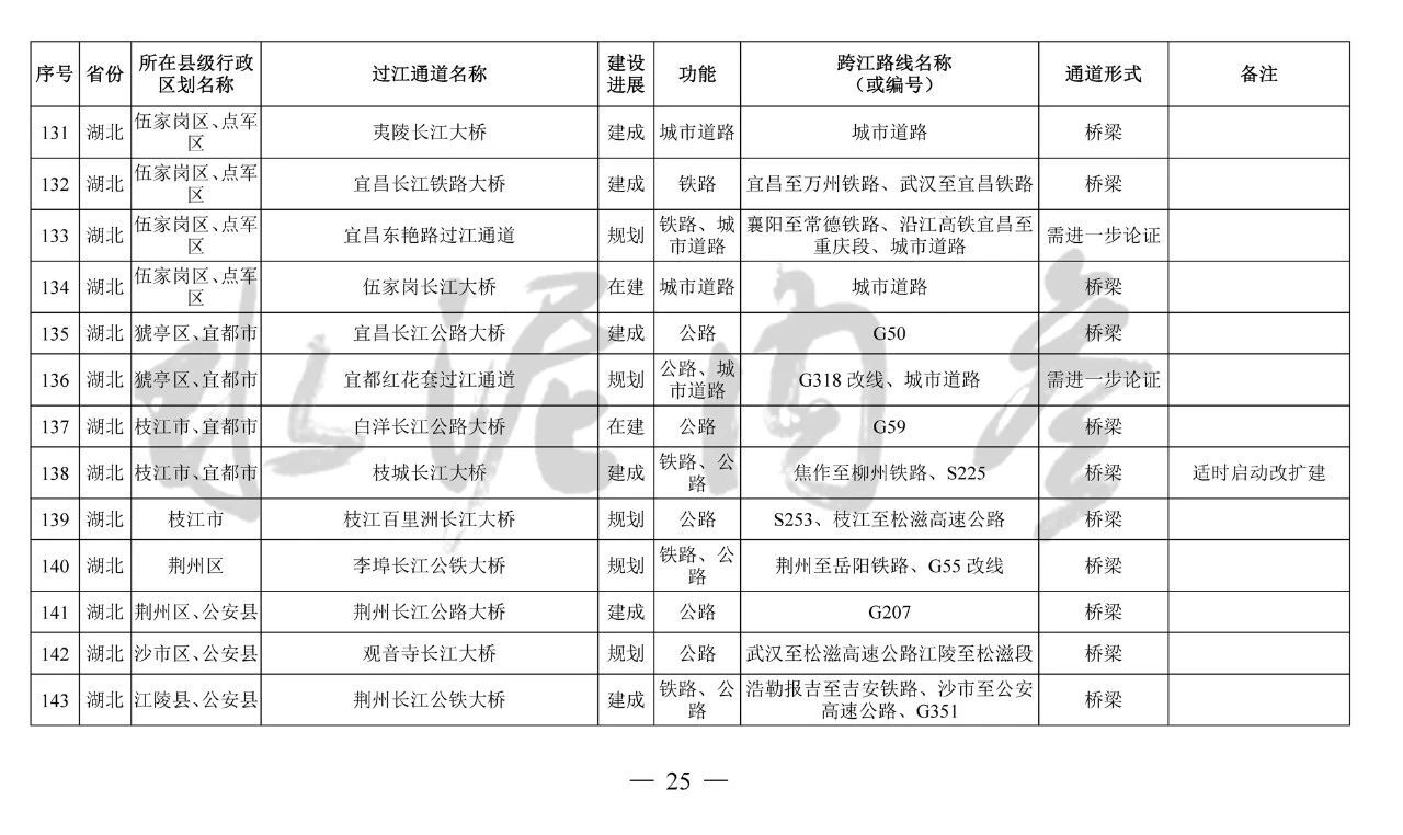 湖北省(24座):巴东长江公路二桥、兴山至长阳高速公路过江通道、宜昌东艳路过江通道、宜都红花套过江通道、枝江百里洲长江大桥、李埠长江公铁大桥、观音寺长江大桥、武汉都市区环线汉南过江通道、军山长江二桥、武汉轨道17号线过江通道(青菱过江通道)、武汉白沙洲过江通道、武汉轨道12号线白沙洲过江通道、武汉轨道11号线三期汉阳段过江通道、武汉轨道13号线过江通道(小东门过江通道)、二七路过江通道、武汉轨道10号线二七过江通道、武汉轨道12号线丹水池过江通道、堤角过江通道、武汉轨道20号线过江通道、武汉轨道25号线过江通道(长江新城过江通道)、武汉轨道新港线阳逻过江通道、光谷过江通道、新港高速双柳长江大桥、鄂黄第二过江通道鄂湘界(1座):监利至华容公铁两用大桥