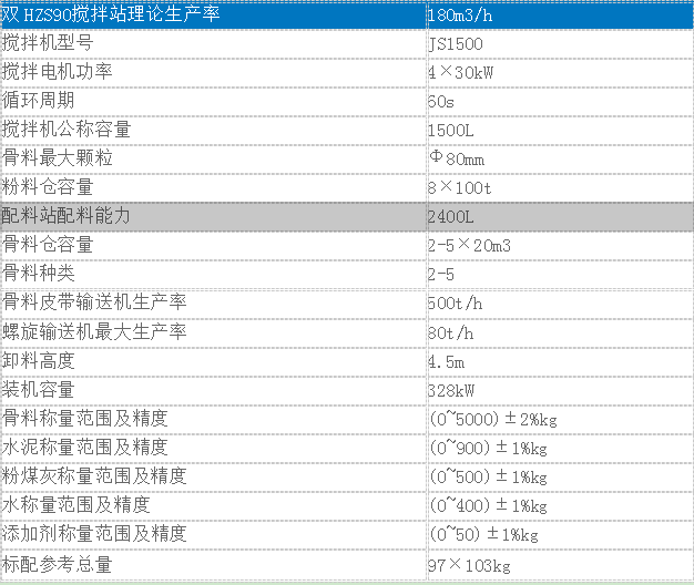 2HZS90商品大型混凝土搅拌站,整套设备包括双卧轴强制搅拌机、配料机、螺旋输送机、水泥仓、输送带和微机控制室。采用JS系列双卧轴强制式搅拌机,可生产塑性、干硬性等多种混凝土,生产效率高,搅拌时间短,外形美观,广泛用于大、中型建筑施工、道路桥梁以及生产混凝土制品的预制厂中,是生产商品混凝土的理想设备。HZS90搅拌站的理论生产率90m3/h,搅拌主机功率为60KW,搅拌机公称容量为1500L,配料机的仓格数为4格,配料能力2400L,3×100t,粉料仓容量水泥称量范围及精度(0~1500)±1%kg,外加剂称量范围及精度(0~50)±1%kg,骨料称量精度为±2%,卸料高度为3.8米,装机总功率为179.5KW,以便满足生产需求。