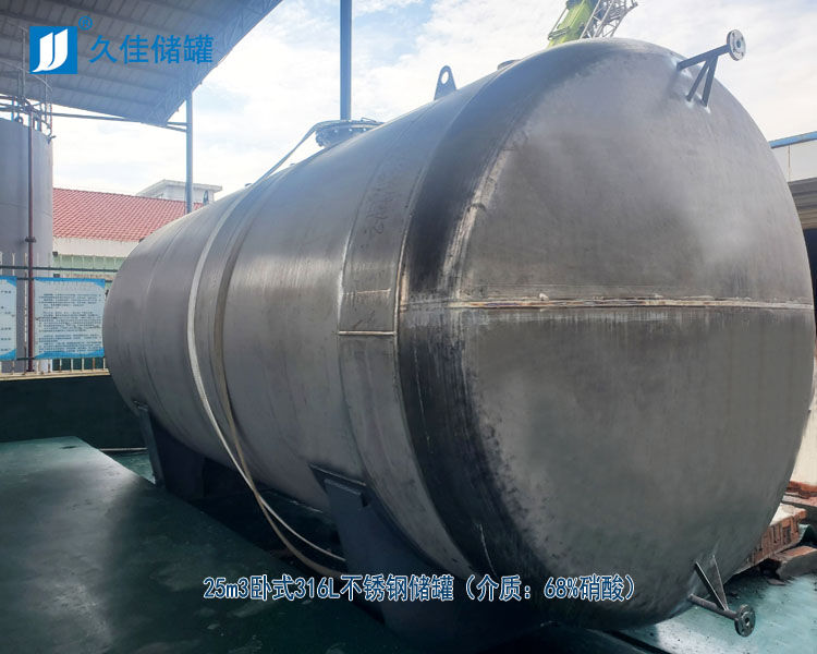 市场上普通试剂级硝酸浓度约为68%左右,而工业级浓硝酸浓度则为98%,通常发烟硝酸浓度约为98%,由于硝酸的危害性很大,不论浓稀溶液都有氧化性和腐蚀性,因此对人很危险,仅溅到皮肤上也会引起严重烧伤,对环境也有不可忽视的影响,储存时一定要科学储存,一旦发生泄漏事故,造成的安全隐患非常严重。在40%以上到68%以下硝酸可采用25吨不锈钢反应罐 工业级硝酸储罐材质 湖南316L不锈钢储罐厂家储存。久佳牌不锈钢硝酸储罐选用进口食品级316L不锈钢板,不锈钢板材特有的优良耐蚀性,可永久性防锈,独特的结构设计全焊接现场组合,具有超卓越的强度,可以很好耐硝酸腐蚀!