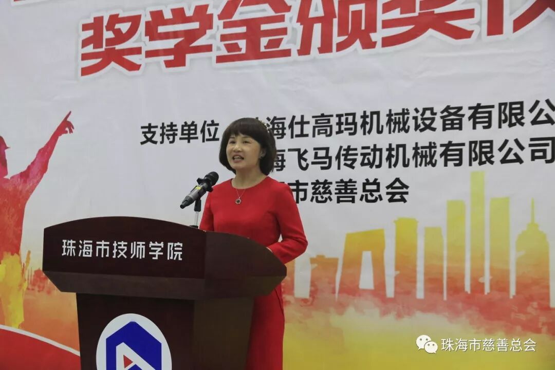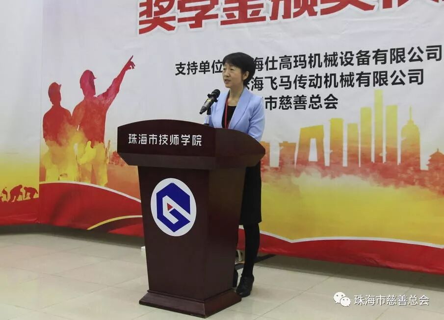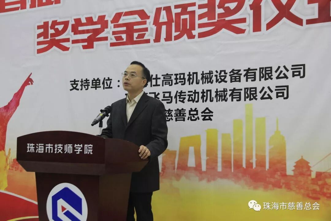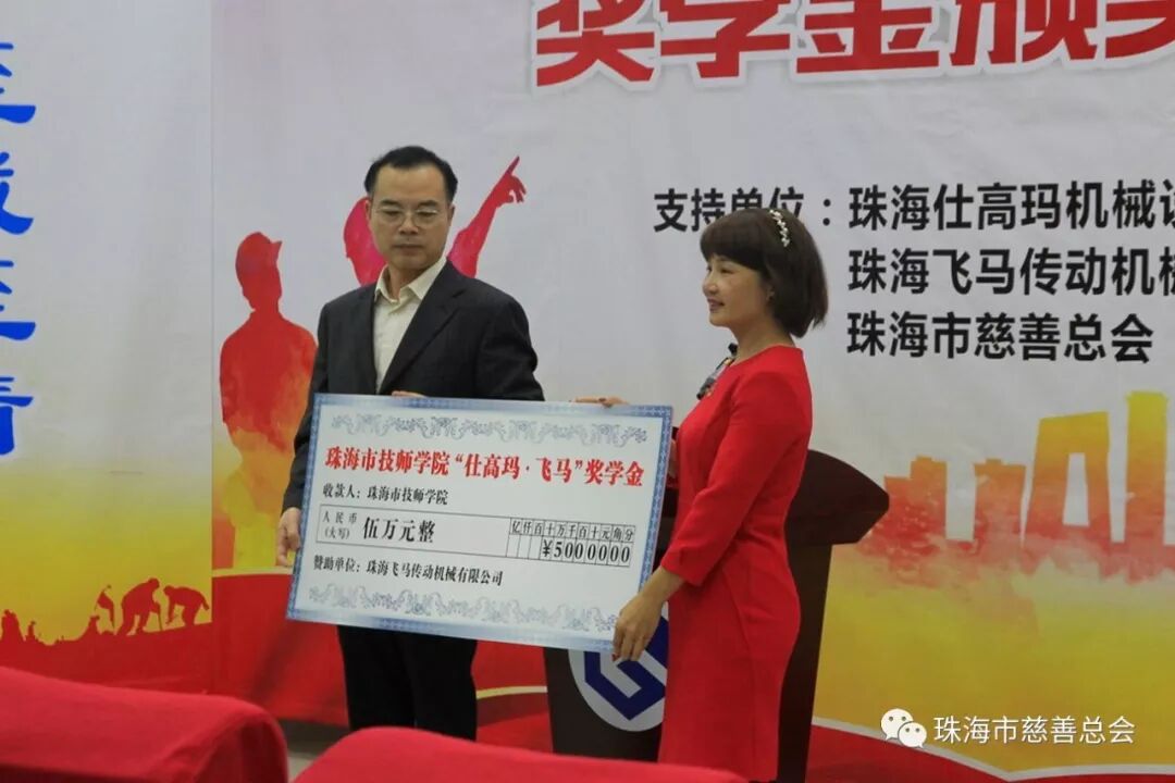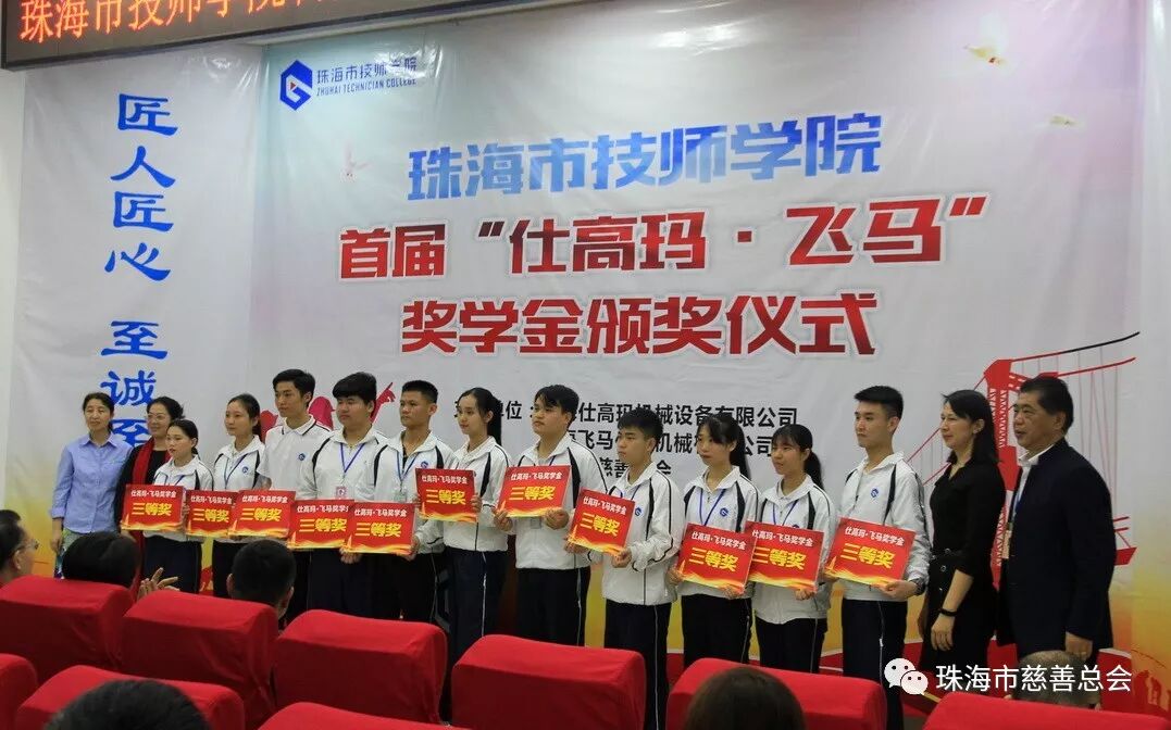 3月5日,珠海市技师学院开学之际——首届“仕高玛·飞马”奖学金颁奖仪式上,68名优秀学子激动地接过由珠海仕高玛机械设备有限公司、珠海飞马传动机械有限公司通过“珠海市慈善总会·仕高玛慈善基金”颁发的“仕高玛·飞马”奖学金,正式开启了他们的新学期、新征程。出席该仪式的有市人力资源和社会保障局副调研员吴少强、职业能力建设科科长林志武,市慈善总会秘书长雷霄,珠海飞马传动机械有限公司副总经理耿建伟,珠海市技师学院全体校领导及获奖学生等。本次“仕高玛·飞马”奖学金共奖励珠海市技师学院品学兼优学生68名,发放奖学金合计近10万元。