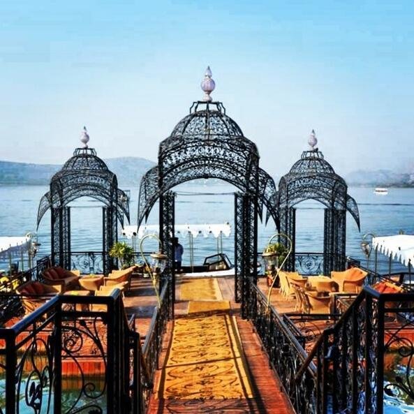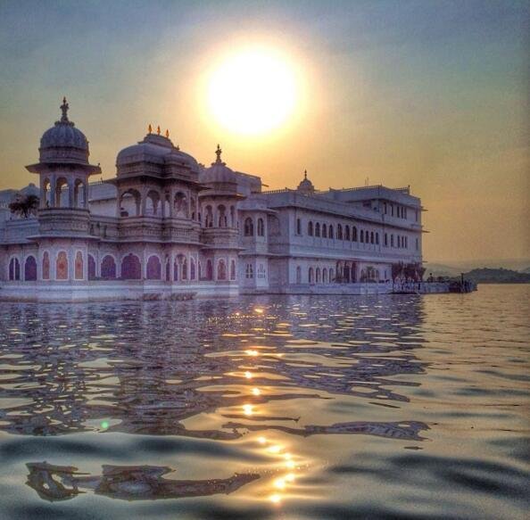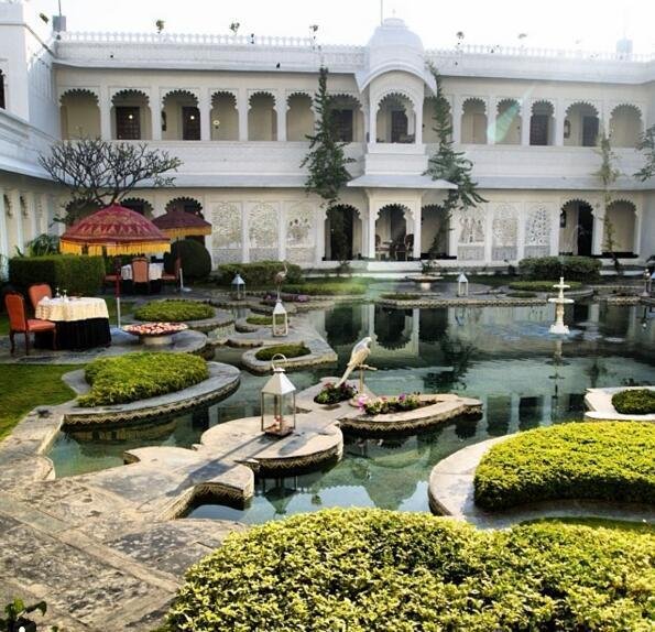 印度泰姬湖宫酒店。这个酒店建在湖的中央,众多宫殿相依偎,酒店周围全是湖水↓