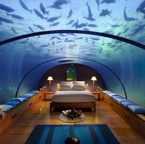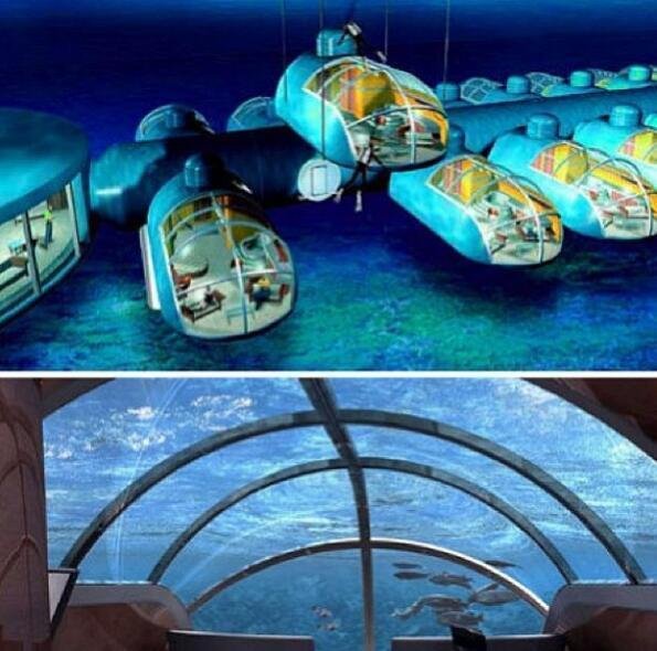 斐济附件的一个私人小岛上的波塞冬海底度假村。道理跟上面的雪屋一样,只是这里的胶囊式房间是筑在海里的。