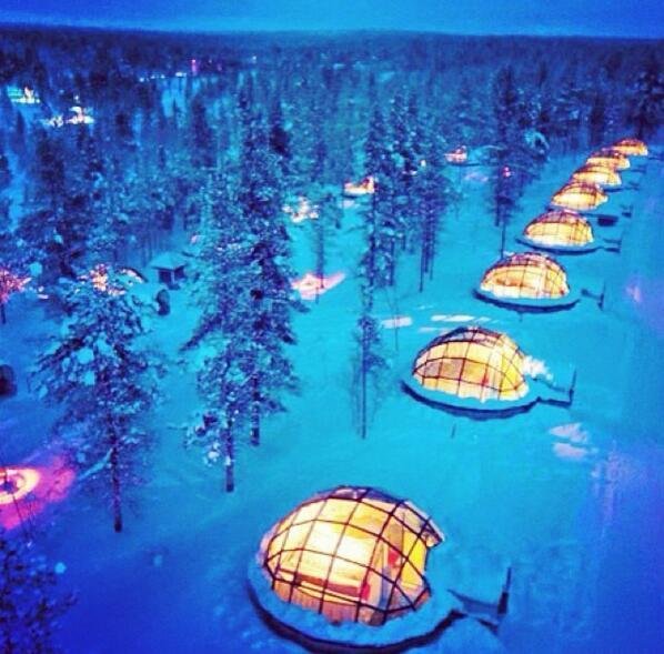 芬兰拉普兰地区的Kakslauttanen酒店,全是这样的木头和玻璃做成的小雪屋。